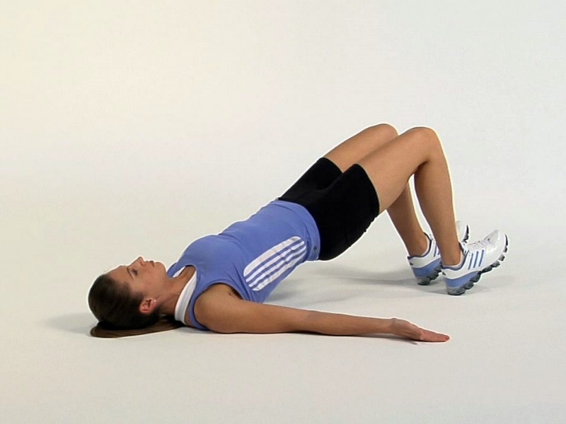إستلقي على ظهرك واثني الركبتين 90 درجة على الأرض ومدّي ذراعيك مفتوحتين جانباً، اثني الركبتين 90 درجة على الأرض، وارفعي الكاحل واتركزي فقط على كعب القدم، ثم ارفعي أردافك حتى تشكّل خطاً مستقيماً مع كامل جسمك واضغطي عليهما ثم عودي وأخفضيهما مرة أخرى وكرّري التمرين مرّات عدة.