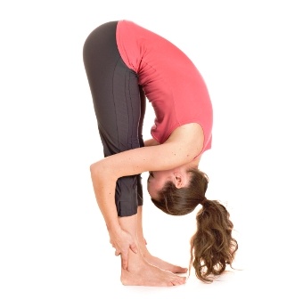 قفي بشكلٍ مستقيم وضمّي قدميك، اخفضي رأسك ليصل حتى كعب القدم ولفّي بيديك أسفل القدم كما في الصورة.
