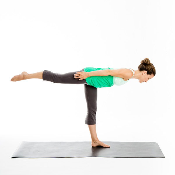 انخفضي ببطء الى الأسفل وثبتّي إحدى رجليك على الأرض وارفعي الأخرى في الهواء، مدّي ذراعيك إلى الخلف للمحافظة على التوازن وحافظي على الخط المستقيم للجسم كما في الصورة.