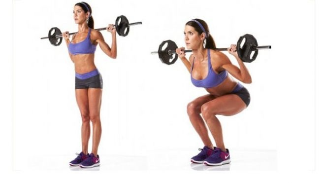 إحملي البار الحديدي مع الأوزان الثقيلة أو الخفية، انخفضي كوضعية الـSquat أي القرفصاء، أرجعي مؤخرتك الى الوراء وحافظي على استقامة ظهرك. إحملي البار الحديدي وضعيه على كتفيك من الأمام وامسكيه بين يديك كما توضح لك الصورة ثم قومي بتكرار التمرين من خلال الوقوف ثم العودة تدريجياً الى الوضعية مرّات عدة.