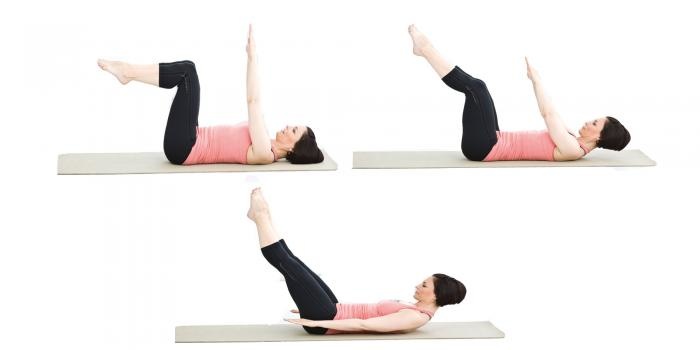 إستلقي على الأرض، مدّي ذراعيك في الهواء واثني الركبتين وارفعيهما أيضاً في الهواء، ثم أخفضي بشكلٍ متوازن ذراعيك مع حركة قدميك ومدّيهما بشكلٍ كامل على مستوى منخفض كما في الصورة.