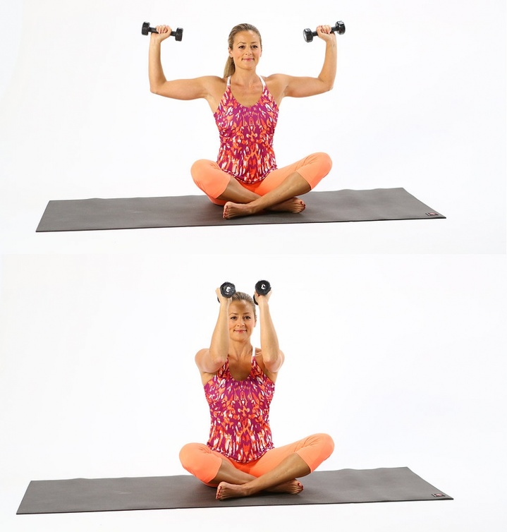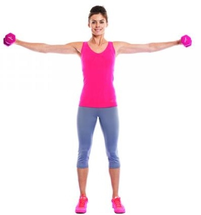 يمكنك الاستعانة في هذا التمرين باستخدام الأوزان الخفيفة. إحملي في الحركة الأولى الأوزان بين يديك وقومي بالحركات المصورة بشكلٍ متتالٍ. إرفعي ذراعيك واثنيهما أمام رأسك ثم افتحيهما واسعاً جانباً ثم عودي ومديهما كلياً الى الأمام قبل أن تقومي بإعادة الحركات مجدداً.