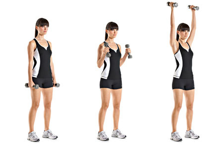 إجلبي أوزاناً خفيفة من الDumbbell واحمليهم بين يديك. قفي بشكلٍ مستقيم واتجاه اليدين صوب الأرض. في الحركة التالية إرفعي يديك واثنيهما صوب الكتفين ثم ارفعيهما مجدداً ومديهما كلياً في الهواء فوق رأسك كما في الصورة ثم انزليهما بإعادة الحركات بشكلٍ معكوس. أعيدي تكرار الحركات سريعاً بين 15 الى 20 مرة.