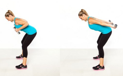 إستعيني مجدداً بأوزان الـDumbbells، أخفضي جسمك قليلاً، رأسك صوب الأرض وارجعي مؤخرتك الى الخلف. في الحركة الأولى، مدّي يديك صوب الأرض ثم قربيهما واثنيهما صوب صدرك، في الحركة الأخيرة قومي بارجاعهما الى الخلف ومديهما بشكلٍ كامل في الهواء كما تشرح لك الصورة.