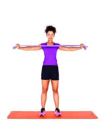 إحملي الربطة الرياضية الصغيرة بين يديك، قفي بشكلٍ مستقيم ومدّي ذراعيك أمامك. شدّي الربط من خلال فتح الذراعين جانباً ثم تقريبهما مجدداً أمامك كما في الصورة. كررّي التمرين أيضاً من 15 الى 20 مرة.