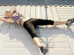 إستلقي على الأرض، ضعي يديك خلف رأسك ومدّي قدميك كلياً بحيثتكونان متلاصقتينمعاً، إرفعي رأسك والجزء العلوي من الجسم قليلاً كأنك تقومين بتمرين الCrunches. قومي بتكرار التمرين 50 مرة.