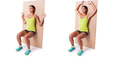 إتكئي على الحائط وقومي بحركة الSquat كما في الصورة، إنخفضي واضغطي بظهرك على الحائط واثني يديك 90 درجة في الحركة الاولى على الحائط ثم قومي برفعهما معاً ومديهما فوق رأسك وحاولي أن يلمسا بعضهما البعض. ثم انزيلهما وعاودي الحركة مرّات عدة.