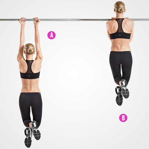 إمسكي البار الحديدي Chineup الموجود في الصالة الرياضية أو علّقي أي قطعة حديدية في المنزل. إشبكي قدميك من الخلف ومدّي يديك كلياً. في الحركة الثانية، إرفعي نفسك واضغطي قدر استطاعتك، إثني يديك حتى يصل رأسك فوق البار مع المحافظة على وضعية القدمين كما تظهر لك الصورة.