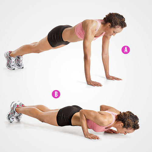 ضعي كفي يديك على الأرض بشكلٍ مسطح وقرّبيهما من بعضهما كما في الصورة. إرفعي نفسك باستخدام ذراعيك واجعلي جسمك خطاً مستقيماً من رأسك إلى كعبك. إخفضي الجذع الخاص بك واجعلي الكوعين على مقربة منك عند إخفاض جسمك صوب الأرض لمزيد من المقاومة. حافظي لوقت قليل على الوضعية، ثم إدفعي جسمك الى الأعلى لمعاودة تكرار التمرين.