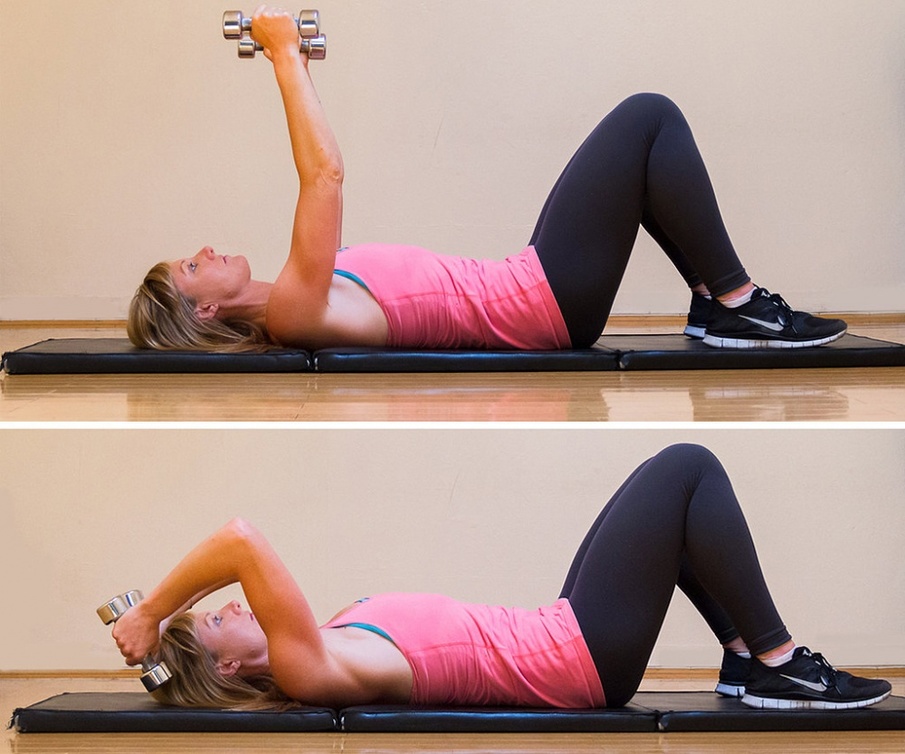 إستلقي على المقعد أو على السجادة الرياضية واثني ركبتيك على الأرض. إحملي الأوزان بين يديك ومدّي يديك كلياً صوب السقف وقرّبيهما جنب بعضهما البعض. ثم قومي بثنيهما وأنزليهما صوب رأسك على أن يكون كوعك موجهاً صوب الخارج.