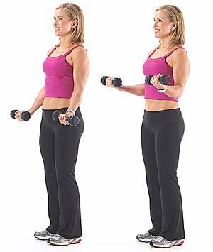 قفي أولاً بشكل مستقيم واحملي الأوزان بين يديك ووجهّي ذراعيك صوب الخارج. في الحركة الأولى مدّيهما كلياً الى جانب جسمك، ثم في الحركة التالية إثنيهما واضغطي عليهما وقرّبيهما صوب كتفيك.