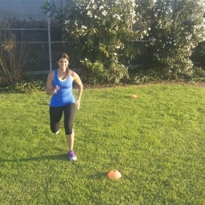 ضعي 4 مجسمات أو مخروطات على شكل مربع واتركي مسافة 8 أقدام فاصلة. إركضي من نقطة البداية الى أعلى مجسم في الخط نفسه ثم اتجهي يساراً إلى المجسم الثاني الذي بموازاته. تراجعي للخلف ووجهك للأمام للوصول إلى المجسم الأيسر السفلي ثم اتجهي يميناً نحو المجسم الأيمن الأول كما في الصورة. كرّري التمرين من 12 الى 18 مرة ومن 4 الى 6 مرات في كل محاولة.