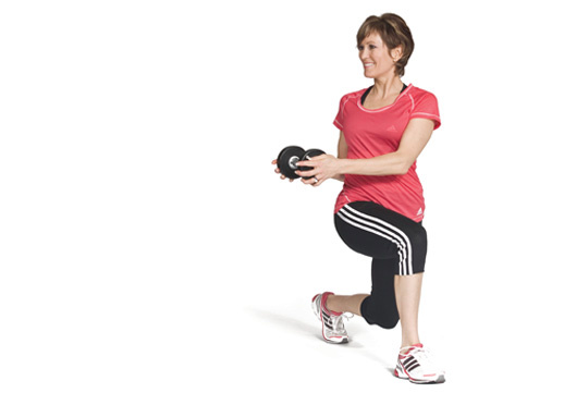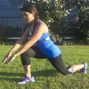قفي أولاً بشكلٍ مستقيم ثم انحني للأمام واثني الركبة الأمامية كما في وضعية الLunges ومدّي القدم الخلفية على أن لا تلمس الأرض. في الحركة الأولى مدّي يديك أمامك وصوب الأرض ثم ارجعي إلى الوضعية الأساسية. في الحركة الثانية، تقدمّي أيضاً كوضعية الLunges ثم لفّي جسمك لناحية اليمين وارفعي يدك اليسرى في الهواء ومدّي يدك اليمنى صوب الناحية ذاتها ثم عودي للوضعية الأساسية. كرّري في الحركة الثالثة الحركة السابقة ولكن مع الإلتفاف صوب الناحية اليسرى. في الحركة الأخيرة قومي أيضاً بوضعية الLunges ثم ارفعي يديك عالياً في الهواء. كرّري مجموعة هذه الحركات من 2 الى 3 مرات و6 إلى 8 مرات في كل محاولة.