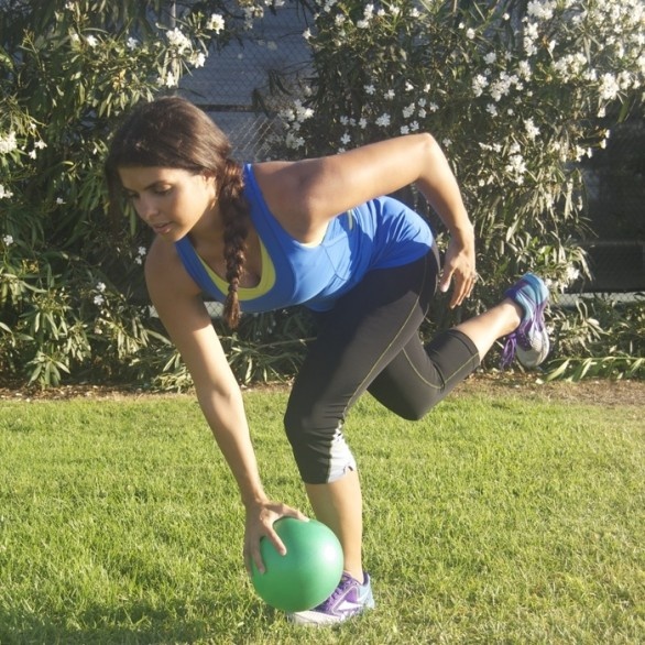 إحملي الكرة الطبية بيدك اليمنى واثنيها عالياً 90 درجة قرب رأسك. إرفعي قدمك اليمنى أيضاً واثنيها وارتكزي على قدمك اليسرى. إنحني صوب الأرض وأرجعي قدمك اليمنى إلى الخلف للمحافظة على التوازن والمسي بيدك اليمنى مع الطابة أصابع قدمك اليسرى كما في الصورة. تدريجياً إرجعي إلى الوضعية الأساسية وكرّري التمرين من 2 الى 3 مرات ومن 10 الى 12 مرة في كل محاولة ولكل قدم على السواء.