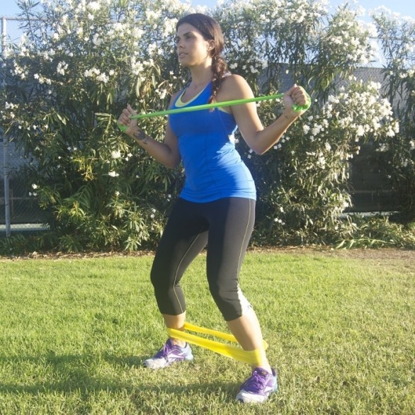 ضعي الResistance Band بين قدميك فوق الكاحل ثم احملي ربطةً ثانية بين يديك. في الحركة الأولى قفي بشكلٍ مستقيم ولا تبعدي قدميك كثيراً، أما في الحركة الثانية فافتحي قدميك بشكلٍ أوسع وافتحي يديك كلياً من الناحيتين كما في الصورة. كرّري التمرين من 2 الى 3 مرات ومن 12 الى 16 مرة في كل محاولة.