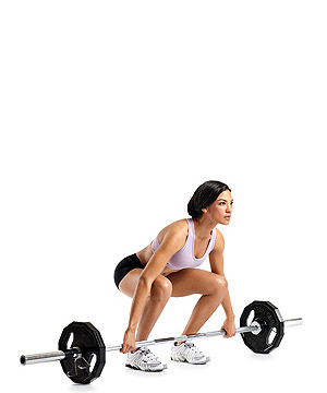 إحملي البار الحديدي الموجود في أي صالة رياضية وقرّبيه صوب جسمك، وقفي أولاً بشكلٍ مستقيم واتركي مسافة بين يديك لا تتعدى مستوى كتفيك. إنحفضي تدريجياً صوب الأرض، واثني ركبتيك وحافظي على يديك ممدودتين كلياً كما تشرح لك الصورة.