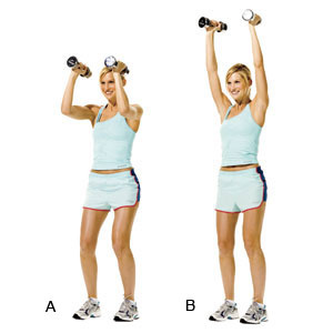 إحملي أوزان الـDumbbells  بين يديك، قفي أولاً بشكلٍ مستقيم، وارفعي ذراعيك أمام وجهك مثنيتين، وانخفضي صوب الأرض واثني الركبتين قليلاً، في الحركة التالية إرفعي جسمك وقفي بشكلٍ مستقيم ومدّي ذراعيك كلياً مع الأوزان في الهواء صوب السقف. كرّري التمرين من 10 الى 12 مرة.