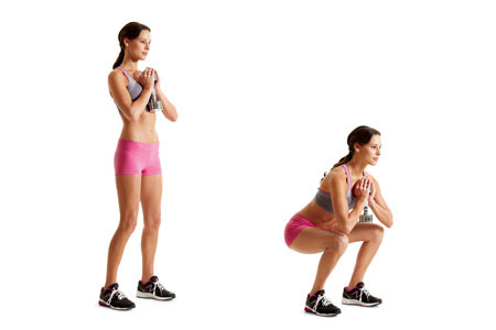 قفي بشكلٍ مستقيم واتركي مسافة صغيرة بين قدميك. إحملي أوزان الDumbbells بين يديك وارفعي ذراعيك أمامك على مستوى صدرك. إنحفضي تدريجياً لتتخذي وضعية القرفصاء، إثني ركبتيك وارجعي مؤخرتك وحافظي على وضعية يديك ثم قفي مجدداً.