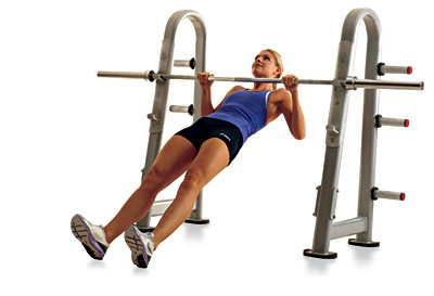 إنحني بجسمك تحت البار Bar الموجود في الصالة الرياضية أو الذي يمكن تركيبه في البيت، مدّي جسمك كلياً وامسكي البار بين يديك وانخفضي في الحركة الأولى حتى تكون يديك ممدودتين. إرفعي صدرك وجسمك صوب البار دون أن تغيّري من وضعية جسمك على أن يصبح رأسك فوق البار.