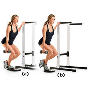ضعي قدمك اليمنى على الStep أو على وزن كبير واستندي أثناء قيامك بالتمرين قرب حائط. إحملي وزناً خفيفاً في يدك اليمنى وارفعي قدمك اليسرى خلف كاحل قدمك اليمنى. إنخفضي قليلاً واثني الركبتين معاً وارفعي عند انخفاضك كعب قدمك اليمنى واستندي على الأصابع. إحرصي على أن تستندي جيداً أثناء قيامك بالتمرين.