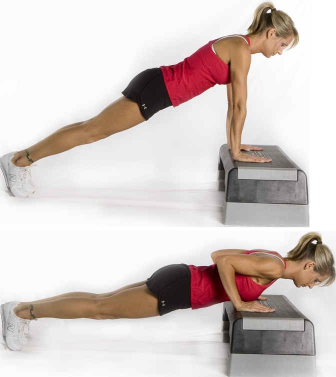 ضعي يديك على سطح مستقر وأوسعي فتح الأكتاف ثم إبدئي بفرد ذراعيك بشكلٍ مستقيم مع خفض المنطقة الوسطى من الجسم بواسطة فرد ذراعيك بزاوية 45 درجة، ثم قومي بدفع ذراعيك حتى تكونا بشكلٍ مستقيم مرة أخرى.