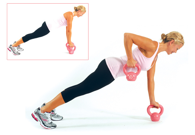 إتخذي وضعية البلانك وارتكزي على الأوزان التي تحمليها بين يديك. إرفعي جسمك عن الأرض كما في الصورة وحافظي على جسمك خطاً مستقيماً. في الحركة التالية، إثني ذراعك اليمنى أو اليسرى وارفعيها الى الخلف على مستوى الصدر كما في الصورة. أخفضي يدك مجدداً بهدوء لتعودي لوضعية البدء.