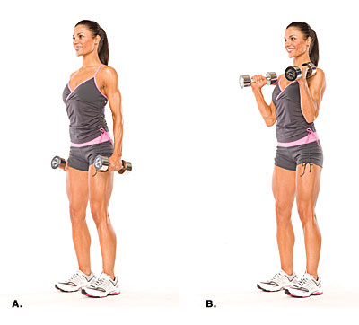 إحملي أوزان الدامبلز Dumbbells بين يديك ومدّي الذراعين قرب الجسم، قفي باستقامة واثني ذراعيك بينما ترفعين الأوزان باتجاه الكتفين. حافظي على الكوعين إلى جانبك ولا تحرّكي جسمك لمساعدتك في حمل الوزن، أخفضي الأثقال بهدوء لتعودي لوضعية البدء.