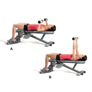 إستلقي على الأرض أو على الآلة المخصصة في الصالة الرياضية، إثني القدمين معاً على الأرض، إحملي أوزاناً خفيفة بين يديك، وارفعيهما في الهواء ثم أخفضيهما واثنيهما الى الخلف على مستوى الصدر كما في الصورة.