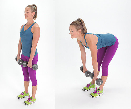 إحملي الأوزان الخفيفة أو الثقيلة بين يديك وانخفضي إلى الامام ومدّي ذراعيك. حافظي على رأسك وظهرك مستقيمين ثم إرجعي الى الوراء وقفي بشكلٍ مستقيم دون تحريك اليدين كما توضح لك الصورة. كرّري الحركة 15 مرة.
