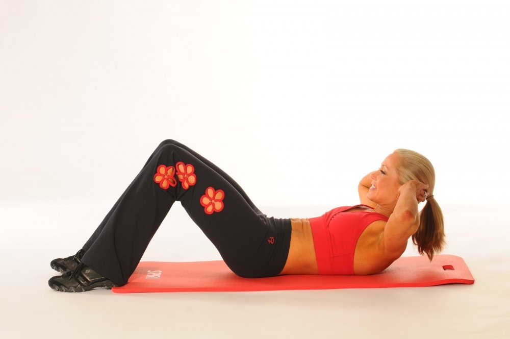 إبدأي بالإستلقاء على الأرض ثم ثبتي يديك خلف الرأس من دون شد عضلات الظهر أو الذراع. حافظي على إستقامة رقبتك قدر المستطاع، ثم إرفعي الجزء العلوي من الجسم للأعلى باتجاه الركبة بعد أن يتم رفعها عن الأرض وثتيها بدرجة 90 درجة وثبيت الكعبين على الأرض. كرّري التمرين 20 مرة.