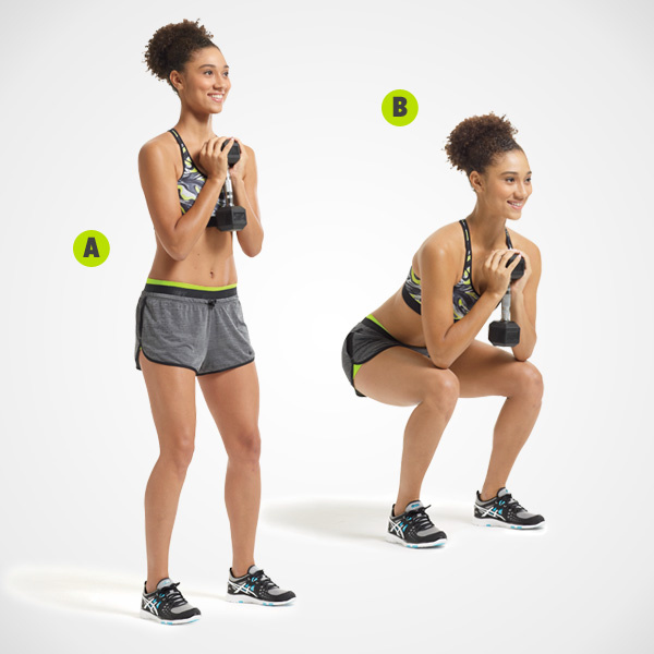 إحملي الأوزان بين يديك واتخذي وضعية الـSquat. إثني ذراعيك بينما ترفعين الأوزان باتجاه صدرك، أخفضي جسمك واثني ركبتيك وارجعي مؤخرتك الى الوراء ولا تحرّكي جسمك لمساعدتك في حمل الوزن. إخفضي الأثقال بهدوء لتعودي لوضعية البدء وكرّري التمرين 15 مرة.
