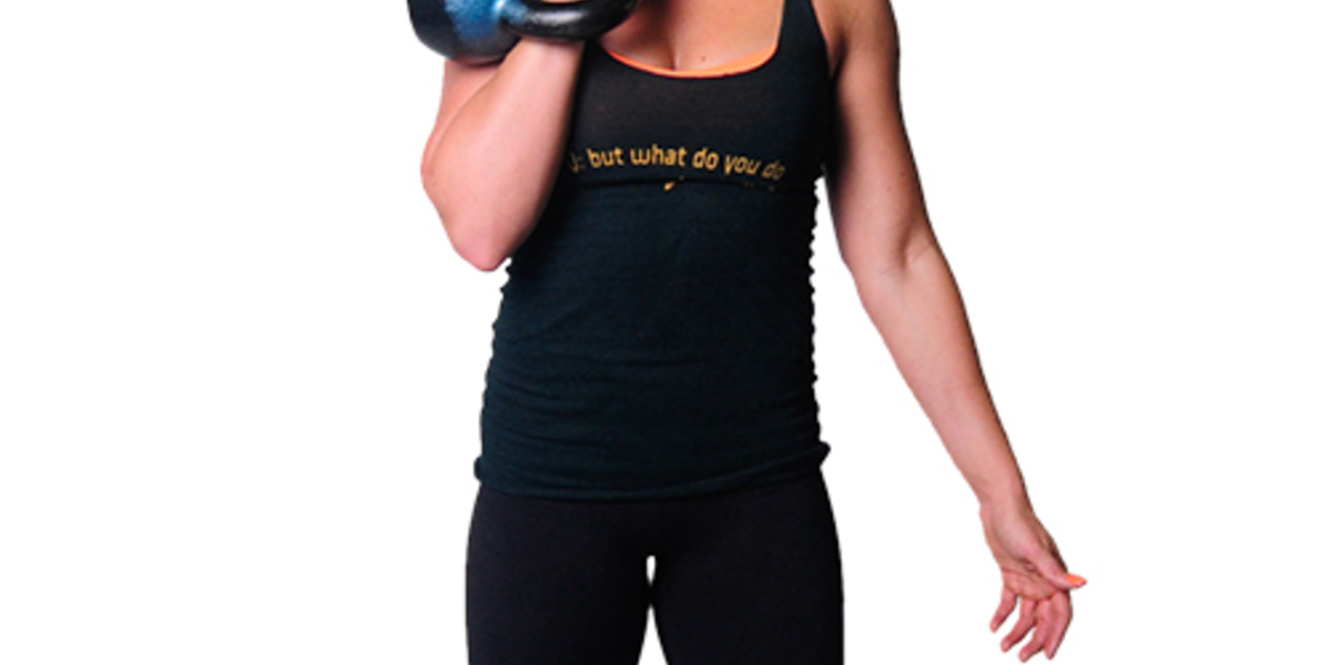 قفي بشكلٍ جانبي واخفضي رأسك صوب الأرض وارجعي مؤخرتك الى الخلف. إحملي الأوزان بين يديك ومدّي أولاً ذراعيك الى الأسفل قرب جسمك ثم اثني مرفقيك وارجعيهما الى الخلف وراء ظهرك، عودي مجدداً وأنزليهما الى الوضعية الأولى. حافظي على ظهرك ورأسك خطاً مستقيماً. كرّري التمرين 12 الى 15 مرة.