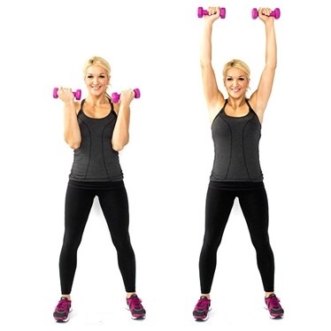 قفي بشكلٍ مستقيم واتركي مسافة صغيرة بين قدميك. إحملي الأوزان بين يديك واثني ذراعيك وارفعي الساعد صوب صدرك على أن يكون كف اليد متجهاً الى الداخل وقرب جسمك. في الحركة التالية، إرفعي يديك ومدّيهما كلياً في الهواء ولفّي اتجاه الساعد الى الخارج. كرّري التمرين 12 الى 15 مرة.