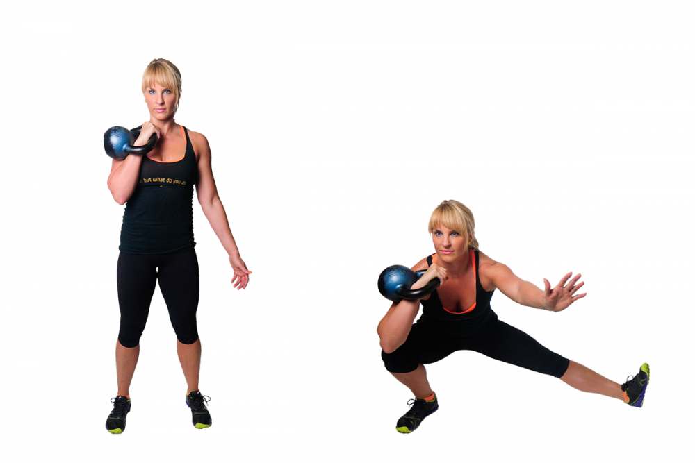 قفي أولاً بشكلٍ مستقيم ثم قومي بخطوة واسعة لقدمك اليمنى الى الجانب واثنيها ومدّي القدم اليسرى وارتكزي على كعب القدم وارفعي أطراف أصابع قدميك صوب السقف وانخفضي قدر استطاعتك وارجعي مؤخرتك الى الخلف كتمرين الSquat. كرّري التمرين 12 مرة ثم بدّلي بين القدمين.