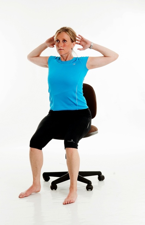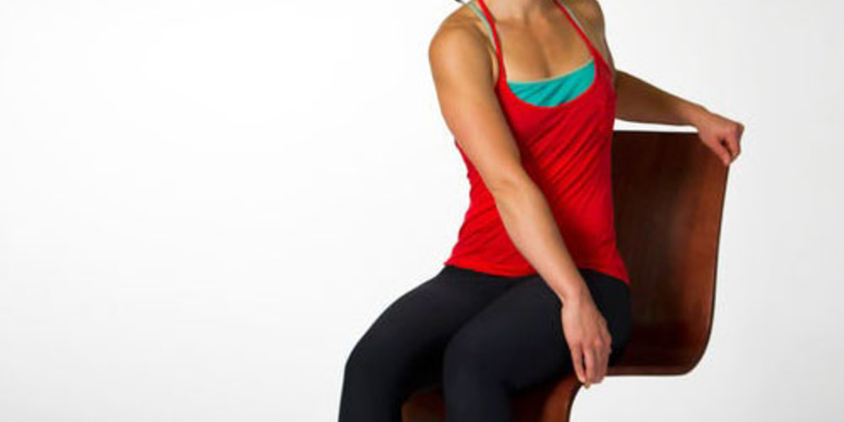 إجلسي على كرسي المكتب ثم ضعي يديك خلف رأسك واضغطي بكتفيك الى الخلف قدر استطاعتك دون أن تحرّكي ظهرك أو جسمك.