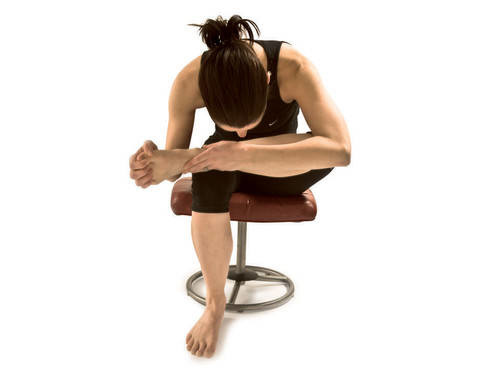 إجلسي على كرسي المكتب، إرفعي قدمك اليمنى وضعيها فوق ركبتك اليسرى. إحني الجزء العلوي من جسمك الى الأمام وامسكي بيدك اليسرى أطراف أصابع قدمك وبرفق إضغطيهما للجهة اليسرى لتفعيل عملية الـStretch.