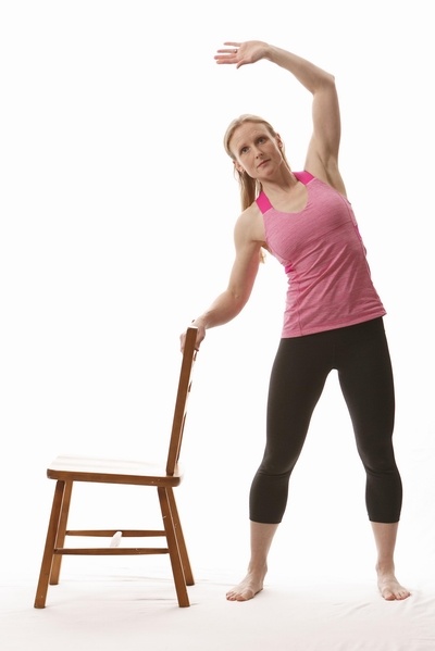 قفي بشكلٍ مستقيم جانباً قرب الكرسي. إرفعي يدك اليمنى وميلي بالجزء العلوي من جسمك ودون تحريك قدميك الى الجهة اليسرى ثم كرّري الحركة بالعكس.