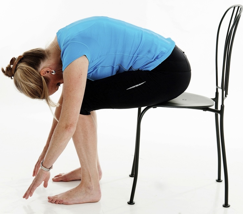إجلسي على الكرسي ثم قومي ببعض الحركات المتتالية. ضعي أولاً يديك على الفخذ واخفضي رأسك قليلاً. في الحركة التالية أخفضي يديك أكثر صوب الركبة واحني الى الأمام. في الحركة الأخيرة، مدّي يديك كلياً صوب الأرض واحني الجزء العلوي من جسمك بين قدميك كما في الصورة.