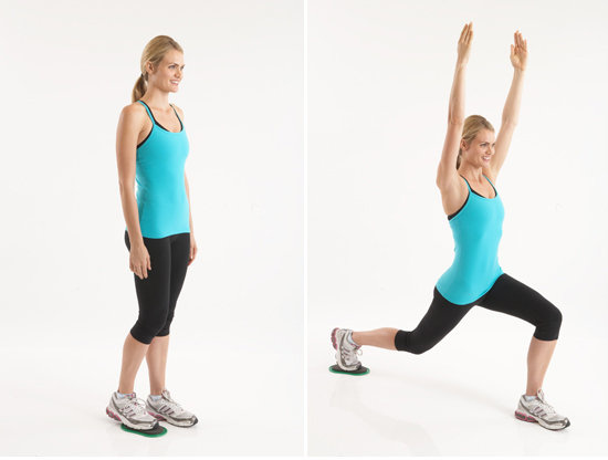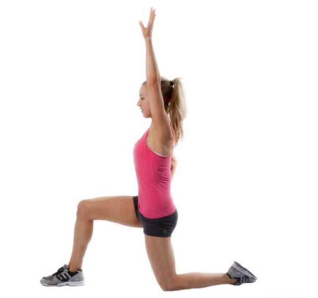 قفي بشكلٍ مستقيم ومشدودة القوام، أرجعي قدمك اليسرى خطوة الى الخلف وارتكزي على الأرض واثني الركبة اليمنى لتتخذ الساق زاوية قائمة. إنزلي واضغطي بكامل قوتك وشدّي عضلات بطنك ومعدتك، ثم إدفعي وركيك وأردافك الى الأمام وارفعي رأسك في الهواء ومدّي يدك المقابلة للركبة الأمامية أي اليسرى في هذه الحالة.