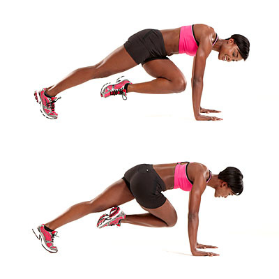 أخفضي الجسم وارتكزي على أطرافك الأربعة وكأنك في وضعية الـPush-Up ، ثم ارفعي الركبة اليمنى واليسرى وقربيها بسرعة إلى منطقة الصدر وانطلقي عن طريق القفز من جهة الى جهة.