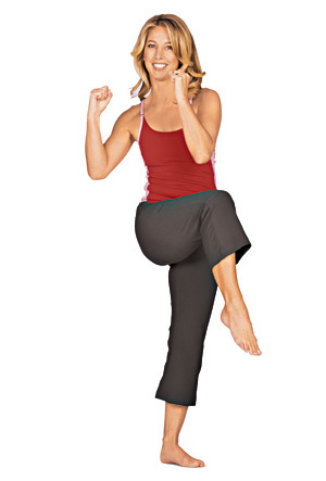 قفي أيضاً بشكلٍ مستقيم، وارفعي قدمك اليسرى واثنيها 90 درجة صوب خصرك ثم قومي بلف جسمك من الناحية اليمنى ليلمس كوعك الأيمن ركبتك اليسرى. بدّلي على التوالي بين القدم اليسرى واليمنى.