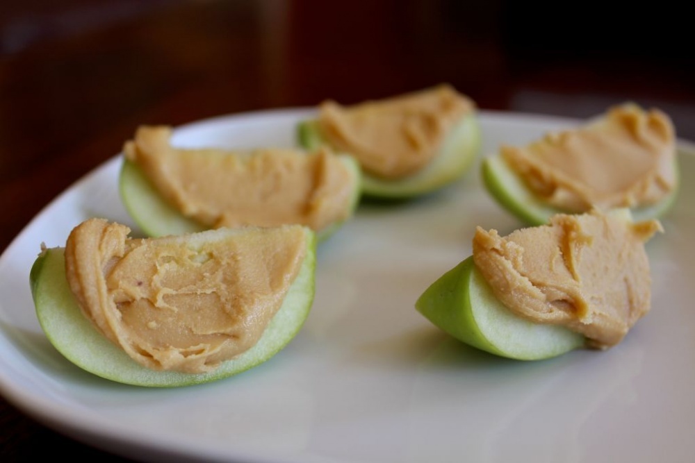 -التفاح مع زبدة الفول السوداني: شرائح التفاح مع زبدة الفول السوداني تعتبر من الوجبات الخفيفة المرضية، ولا تتخطى الـ150 سعرة حرارية. لذلك، هي مناسبة لمدّك بالطاقة والحيوية من دون أن يذهب مجهودك سدى.