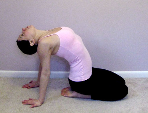 إستخدمي يديك لتقومي بتمرين عميق لإطالة وترخية الجزء الخلفي من الرقبة والظهر العلوي من الجسم. كما في الوضعية السابقة، إجلسي على الأرض وضعي يديك متشابكتين خلف رأسك وإضغطي بلطف نزولا وإخفضي رقبتك لأقصى درجة تستطيع أن تتحملها رقبتك.