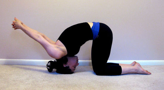 إركعي على ركبتيك واحني الجزء العلوي من الجسم صوب الأرض وارتكزي برأسك على السجادة كما في الصورة. إشبكي يديك معاً ومدّيهما كلياً عالياً في الهواء خلف رأسك.