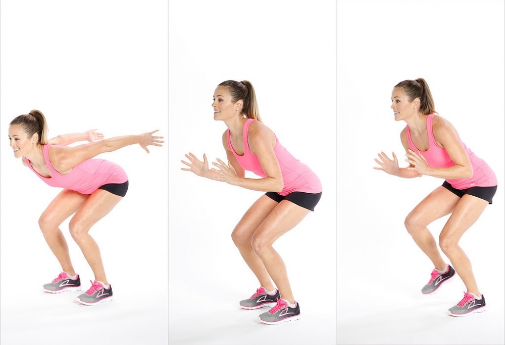 الدقيقة الرابعة: إبدأي أولاً التمرين بحركة الـSquat وانخفضي صوب الأرض وارجعي مؤخرتك الى الوراء. إستعدي للقيام بقفزة كبرى الى الأمام وارتكزي بعد القفزة على وضعية الـSquat مجدداً. إنتقلي من هذه الوضعية لتقومي بعدّة خطوات صغيرة الى الخلف كما تظهر لك الصورة.