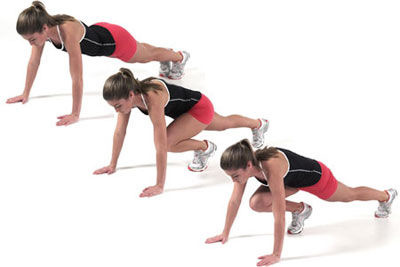 الدقيقة الثامنة: أخفضي الجسم وارتكزي على أطرافك الأربعة وكأنك في وضعية الـPushup، ثم ارفعي الركبة اليمنى وقربيها الى منطقة الصدر ثم اليسرى وانطلقي عن طريق القفز من جهة الى أخرى.