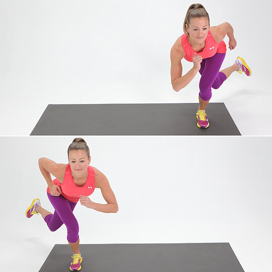 الدقيقة السابعة: إتخذي في الحركة الأولى وضعية الـLunge ثم ادفعي بقدمك اليمنى الى الأمام واثنيها واتركي القدم الثانية ممدودة في الخلف. إقفزي الآن بالقدم الخلفية وارفعيها في الهواء واثنيها في الوقت نفسه على مستوى معدتك، ومدّي القدم الثانية بشكلٍ مستقيم كما تظهر لك الصورة.