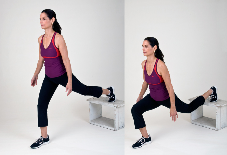 قفي أمام الـStep واتخذي وضعية الوقوف العادية. ضعي يديك على خصرك وأرجعي قدمك اليمنى الى الخلف وارتكزي بأصابع قدمك اليمنى على الـStep واتركي مسافة كبيرة بين قدمك اليسرى الأمامية. إضغطي نزولاً كأنك تقومين بتمرين الـLunges واثني الركبتين معاً الخلفية والأمامية كما تظهر لك الصورة وبدّلي بين القدمين.