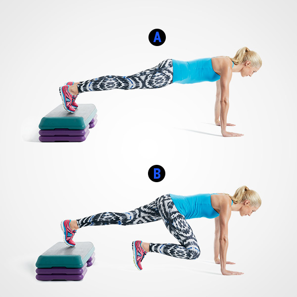 أخفضي الجسم وارتكزي على يديك على الأرض ومدّي جسمك لتتخذي وضعية الـPush-up وضعي أصابع قدميك على الـStep، إرفعي الركبة اليمنى وقرّبيها الى منطقة الصدر ثم اليسرى وانطلقي عن طريق القفز من جهة الى أخرى.