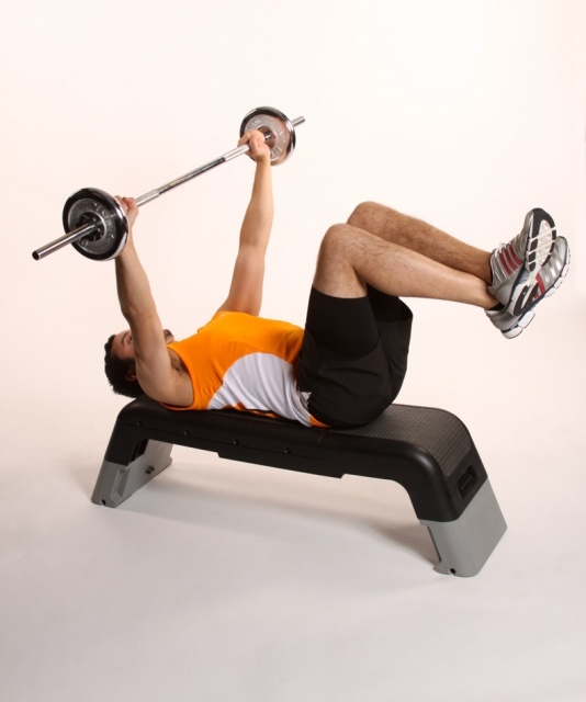 إستلقي على الأرض، وارفعي قدميك واثنيهما 90 درجة في الهواء، إحملي وزنين خفيفين بين يديك ثم قومي بثني مرفقيك وبعدها إرفعيهما ومدّيهما في الهواء. كرّري الحركة مع الحفاظ على وضعية قدميك.